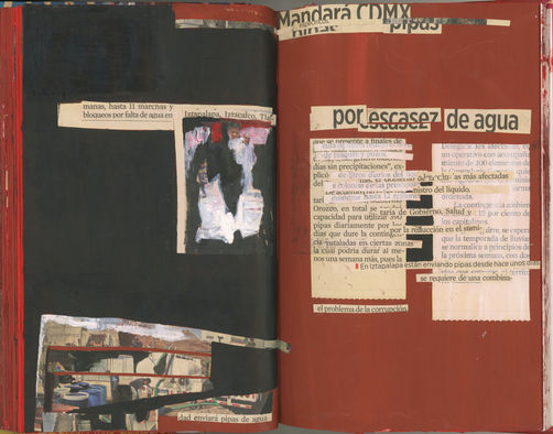 Cuadernos intervenidos con recortes de periódicos y dibujos.